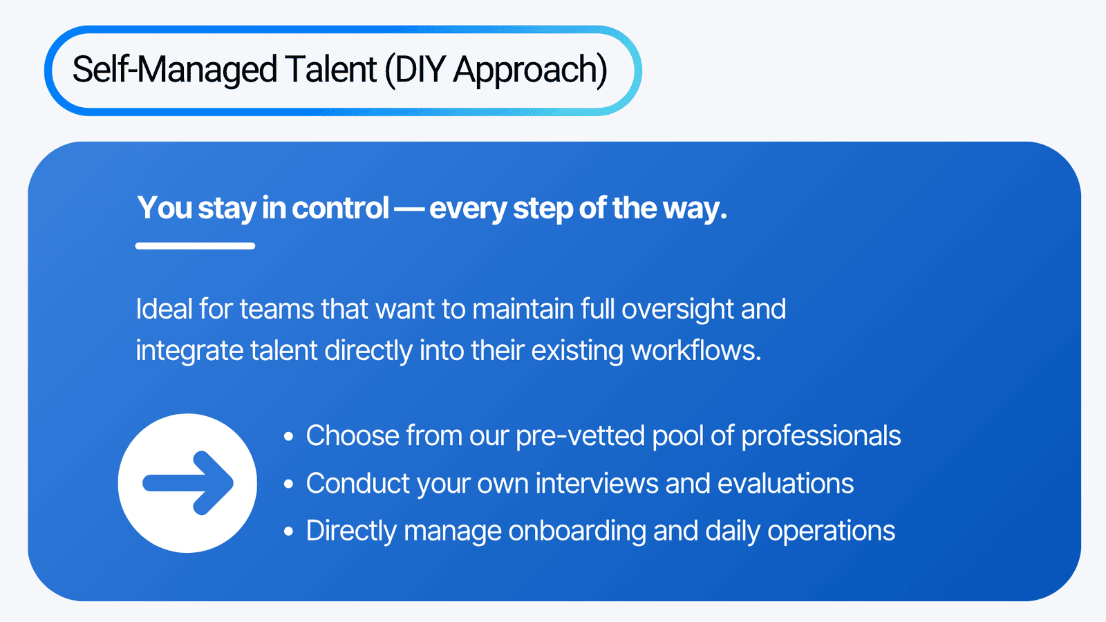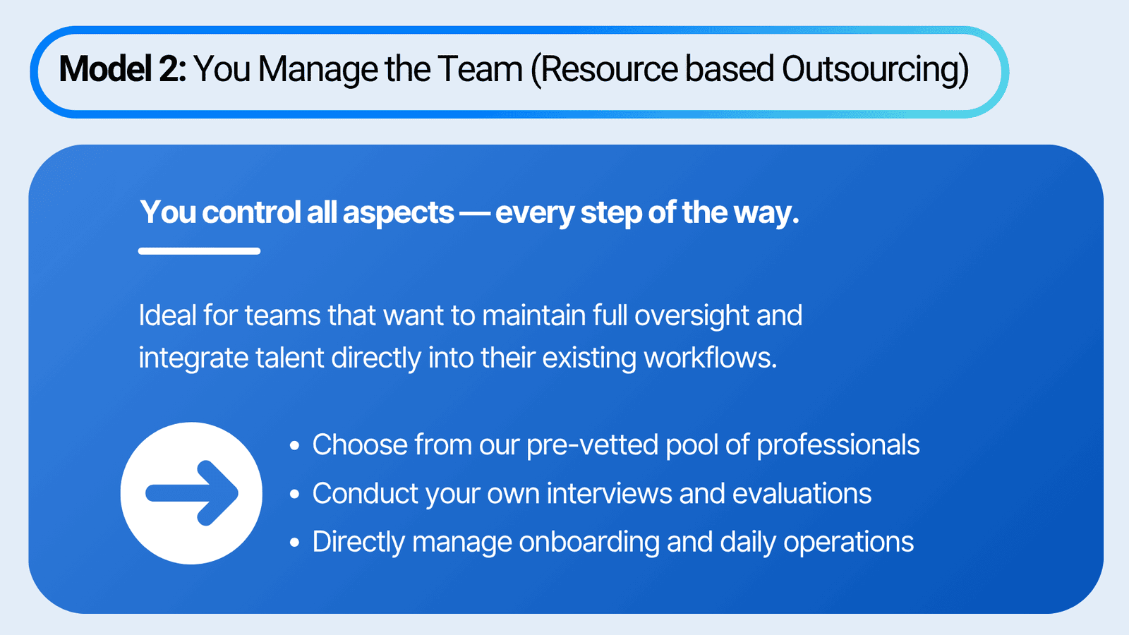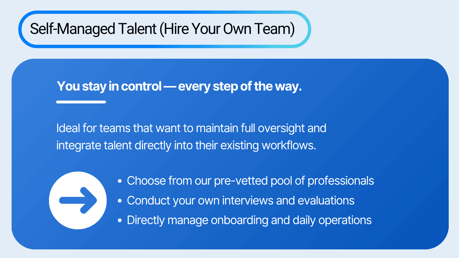Whether you prefer hands-on control or a fully managed experience, BPOHub adapts to your workflow. Our dual-track model empowers you to scale on your terms — either by directly managing the process or by leaving it entirely in our capable hands. The result — faster hiring, better alignment and zero compromise on quality.