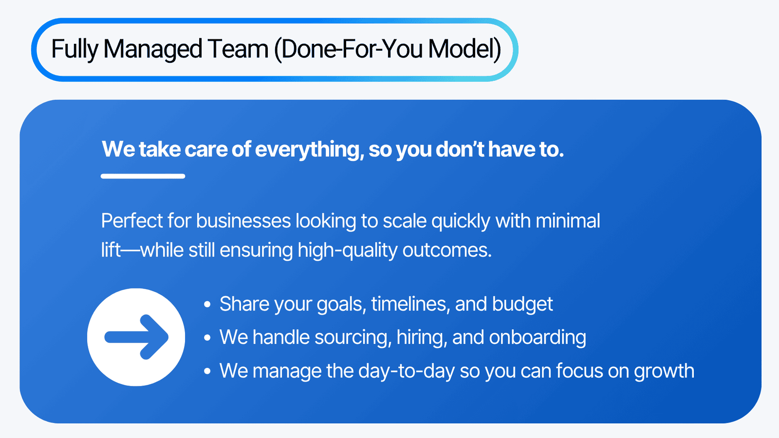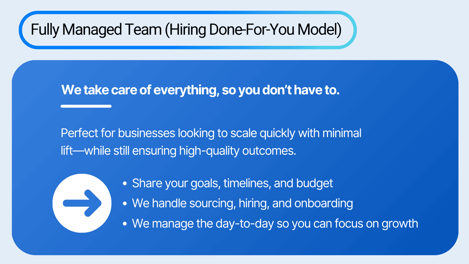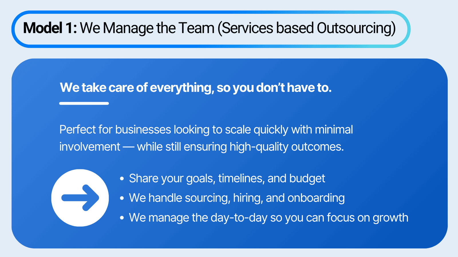 Whether you prefer hands-on control or a fully managed experience, BPOHub adapts to your workflow. Our dual-track model empowers you to scale on your terms — either by directly managing the process or by leaving it entirely in our capable hands. The result — faster hiring, better alignment and zero compromise on quality.