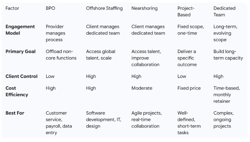 The transition from a short-term, project-based engagement to a long-term, dedicated team relationship mirrors a business’s journey from a tactical, transactional approach to a strategic partnership. A business owner can use the project-based model as a low-risk way to test the waters of offshore hiring and to prove the ROI on a well-defined task. A successful outcome builds the trust and confidence needed to justify a more significant, long-term investment in a dedicated team, thereby supporting long-term growth and seamless scalability. This table provides a concise, comparative overview of the different models, serving as a quick reference guide for a business owner evaluating their options.